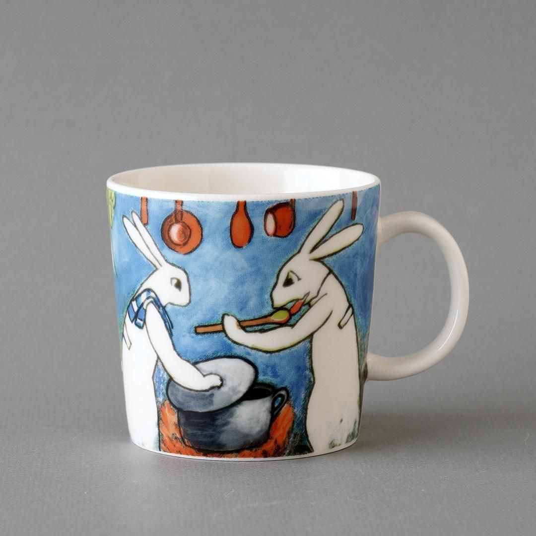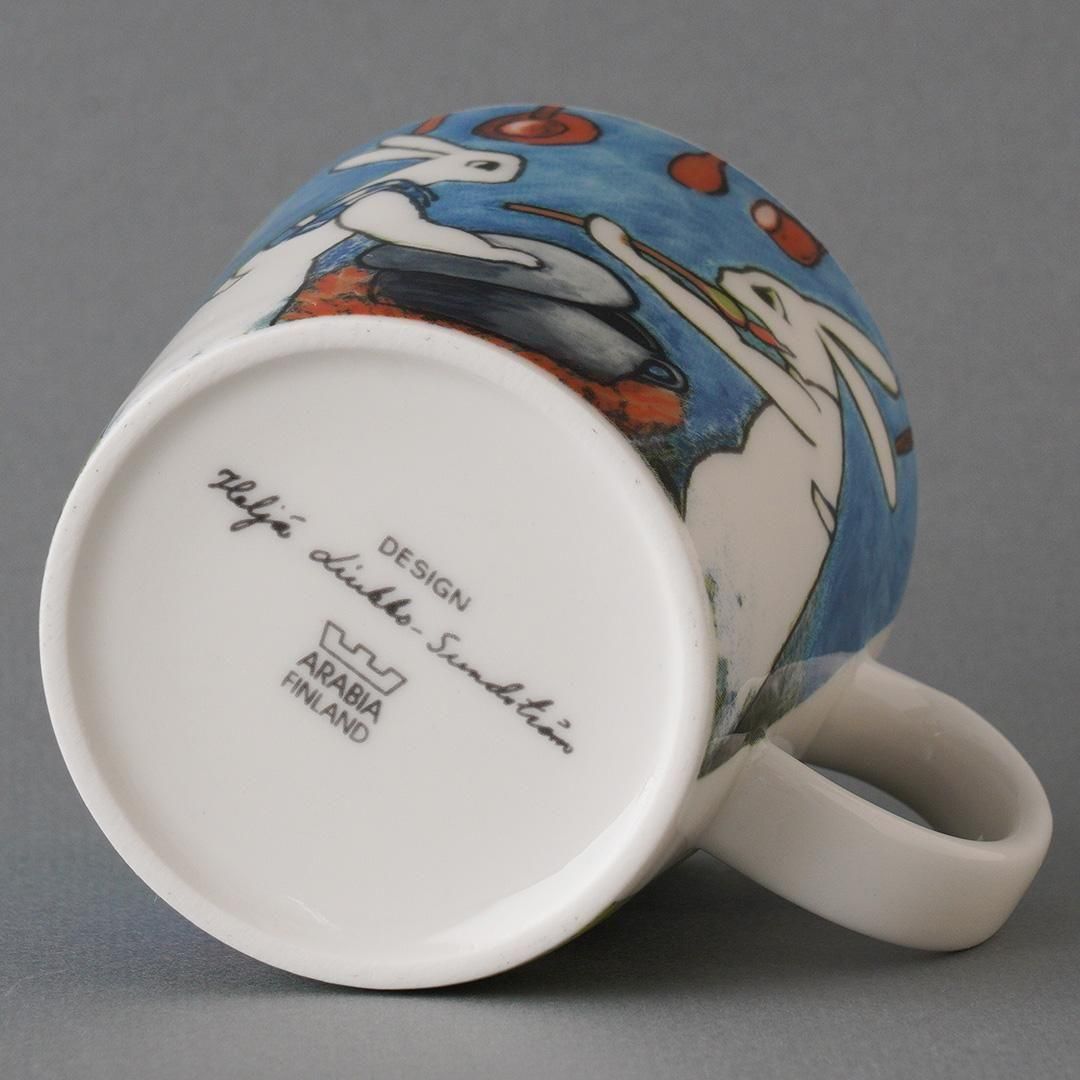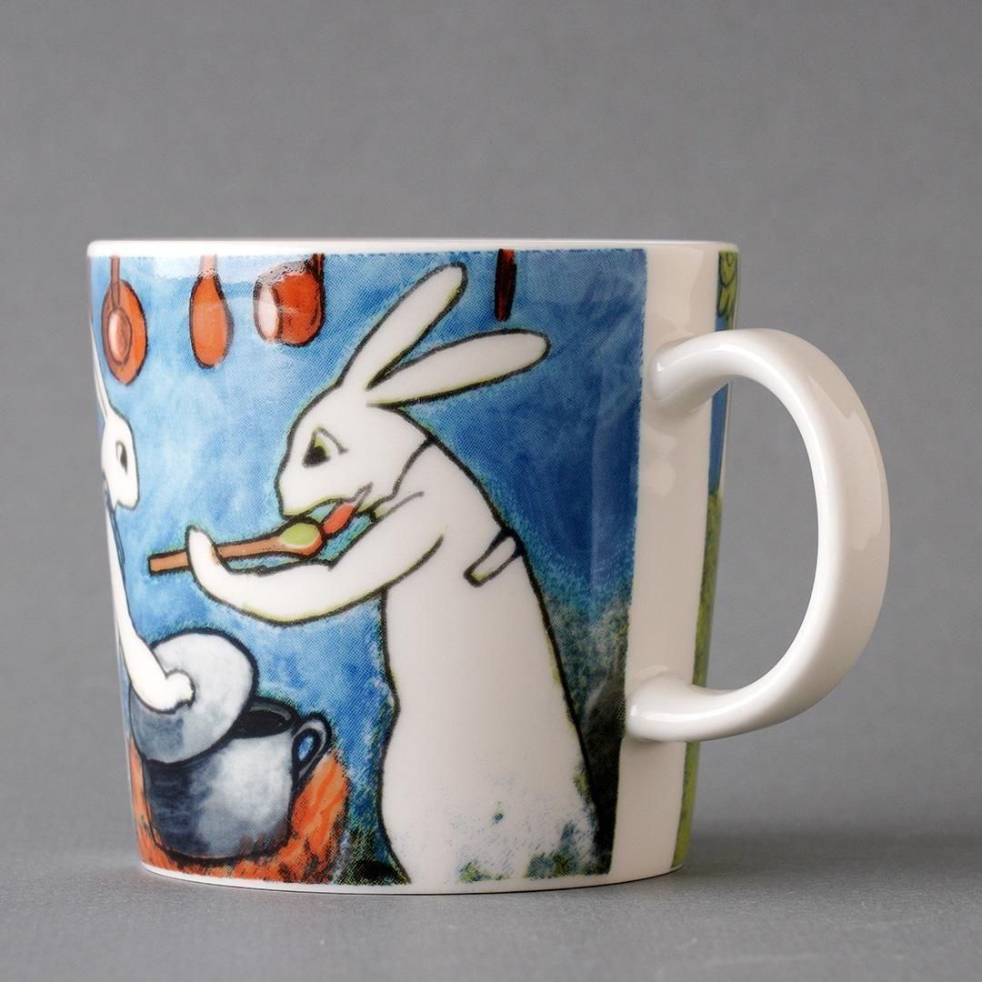 アラビア社のデザイナー、ヘルヤ・リウッコ=スンドストロムは、1981年の陶板絵本「地平線のかなたまで」でウサギを登場させ、その後アラビアのマグカップが誕生しました。ティーマをベースにしたバニーマグは1990年から2011年の期間に生産され、アラビアから販売されたシリーズと企業別注デザインを合わせて28種類前後あります。