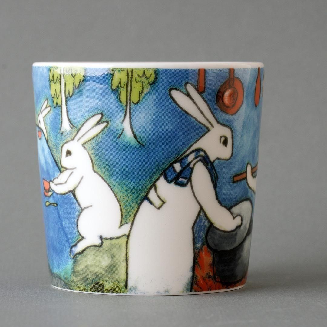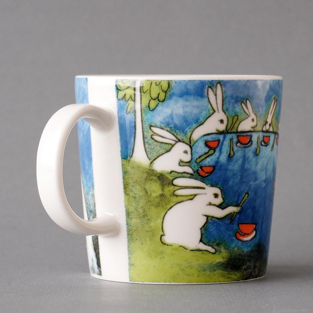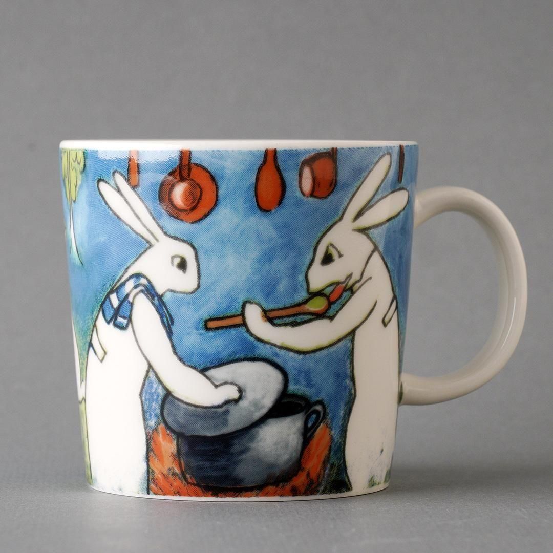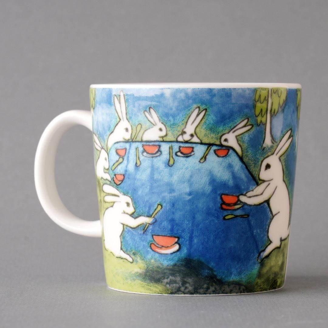 アラビア社のデザイナー、ヘルヤ・リウッコ=スンドストロムは、1981年の陶板絵本「地平線のかなたまで」でウサギを登場させ、その後アラビアのマグカップが誕生しました。ティーマをベースにしたバニーマグは1990年から2011年の期間に生産され、アラビアから販売されたシリーズと企業別注デザインを合わせて28種類前後あります。
